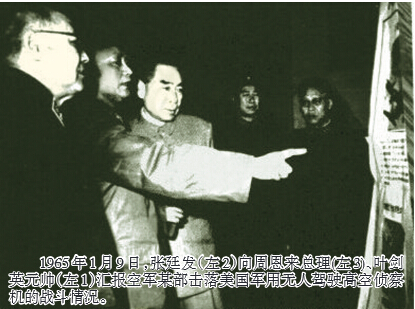(《福建黨史月刊》授權(quán)中國共產(chǎn)黨新聞網(wǎng)獨家發(fā)布,請勿轉(zhuǎn)載) 1965年1月9日,張廷發(fā)(左2)向周恩來總理(左3)、葉劍英元帥(左1)匯報空軍某部擊落美國軍用無人駕駛高空偵察機(jī)的戰(zhàn)斗情況。 1965年1月9日,周恩來和葉劍英在北京聽取空軍關(guān)于兩次擊落美國無人駕駛高空偵察機(jī)戰(zhàn)斗情況的匯報,時任空軍副司令員兼參謀長張廷發(fā)受命匯報。