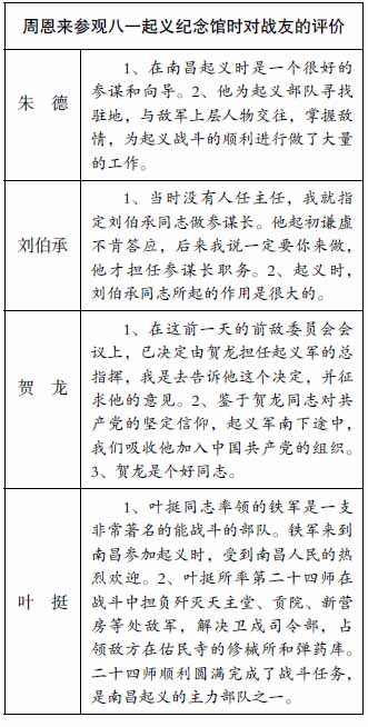 1961 年9 月18 日,中共中央廬山會(huì)議結(jié)束后,參觀(guān)南昌起義總指揮部舊址,即八一起義紀(jì)念館時(shí),周恩來(lái)不談及自己,卻深情回憶戰(zhàn)友,并要求宣傳賀龍、葉挺、朱德、劉伯承等同志在起義中所起的作用。(見(jiàn)表)