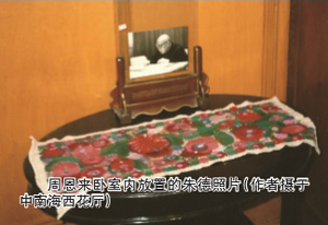 在我國(guó)老一輩的開國(guó)領(lǐng)導(dǎo)人中,周恩來(lái)與朱德經(jīng)過(guò)長(zhǎng)期革命斗爭(zhēng)的嚴(yán)峻考驗(yàn),從相識(shí)、相交到相知,歷經(jīng)半個(gè)多世紀(jì)的風(fēng)風(fēng)雨雨,結(jié)下了深厚的情誼。筆者由于工作關(guān)系,在1992年鄧穎超同志逝世后,曾多次進(jìn)入北京中南海西花廳。在至今仍按原樣保存的周恩來(lái)臥室里,我們見到的只有簡(jiǎn)單的家具和床上普通的鋪蓋,沒(méi)有什么擺設(shè),唯一引人注意的是在周恩來(lái)臥室西側(cè)的一張小圓桌上,端端正正擺放著一幀朱德戴著老花鏡正在看文件的照片,照片前還鋪著一條花毛巾,很像接待國(guó)賓時(shí)鋪下的紅地毯。由此可見周恩來(lái)在世時(shí)對(duì)朱德的敬仰和熱愛(ài)。朱德的女兒朱敏曾動(dòng)情地說(shuō)過(guò):“幾十年內(nèi),周伯伯與父親休戚與共。他們互相尊重,政治上互相鼓勵(lì),工作上相互支持,生活上互相關(guān)懷!边@是她的肺腑之言,也是對(duì)兩位老革命家之間友情的高度評(píng)價(jià)。